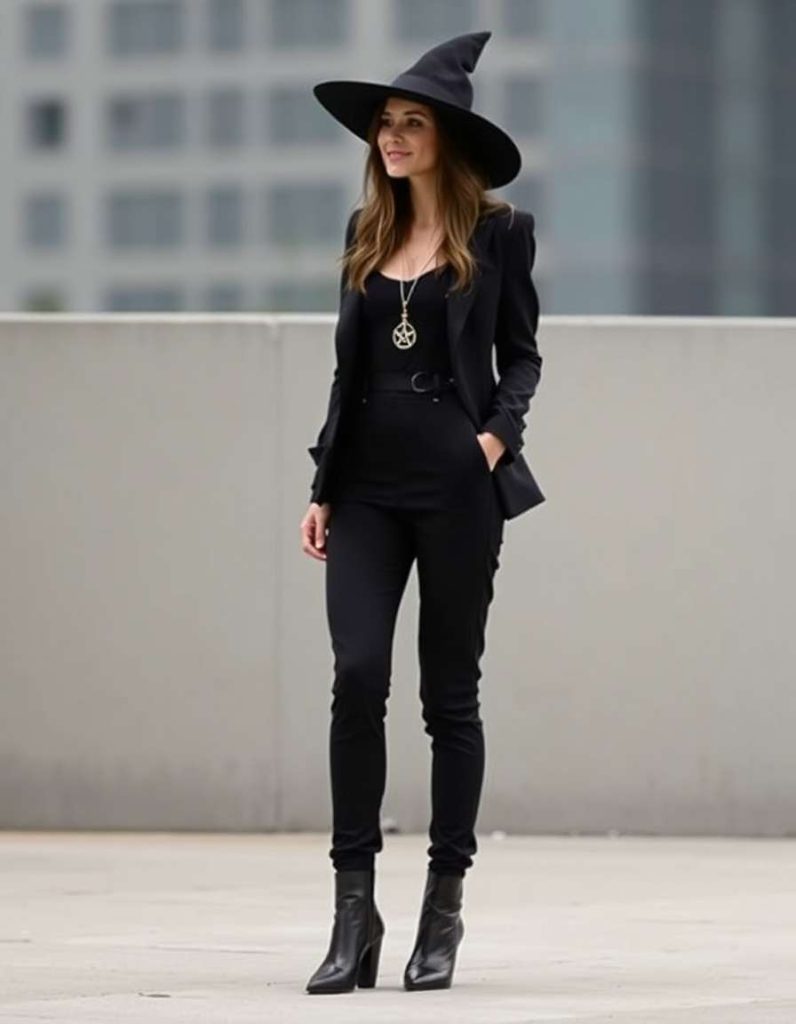 A stylish interpretation of the witch outfits aesthetic, this modern minimalist witch sports a sleek black jumpsuit teamed with pointed-toe boots. A delicate pentagram necklace lends just the right hint of mystique. Effortless yet striking, this outfit captures the spirit of contemporary witchcraft.