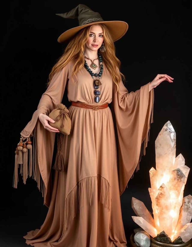 The witch attire aesthetic radiates with crystals and gemstones, showcased in a neutral-toned maxi dress paired with a crystal pendant necklace. Carrying a pouch of crystals, this appearance is ideal for sorceresses who channel the energy of healing stones and the magic of the earth.