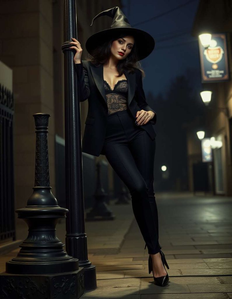 Step into the witch attire aesthetic with a fitted black suit, lace blouse, and chic stilettos. A deep red lipstick and sultry posture embody the noir style, making it perfect for those seeking to add a cryptic, femme fatale allure to their witchy ensemble.