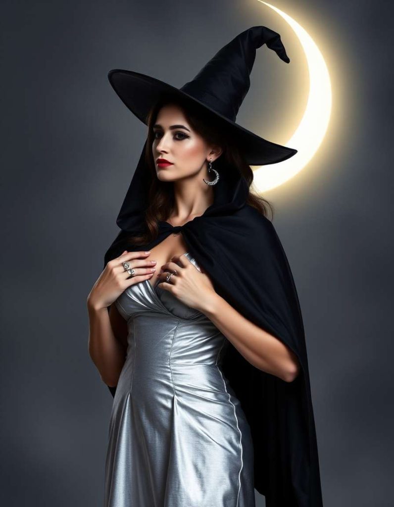 The witch attire aesthetic reaches its zenith under the moonlight with a silver gown and black cloak. Crescent moon earrings and silver rings elevate the ensemble, crafting a perfect outfit for those attracted to the lunar energies of magic.