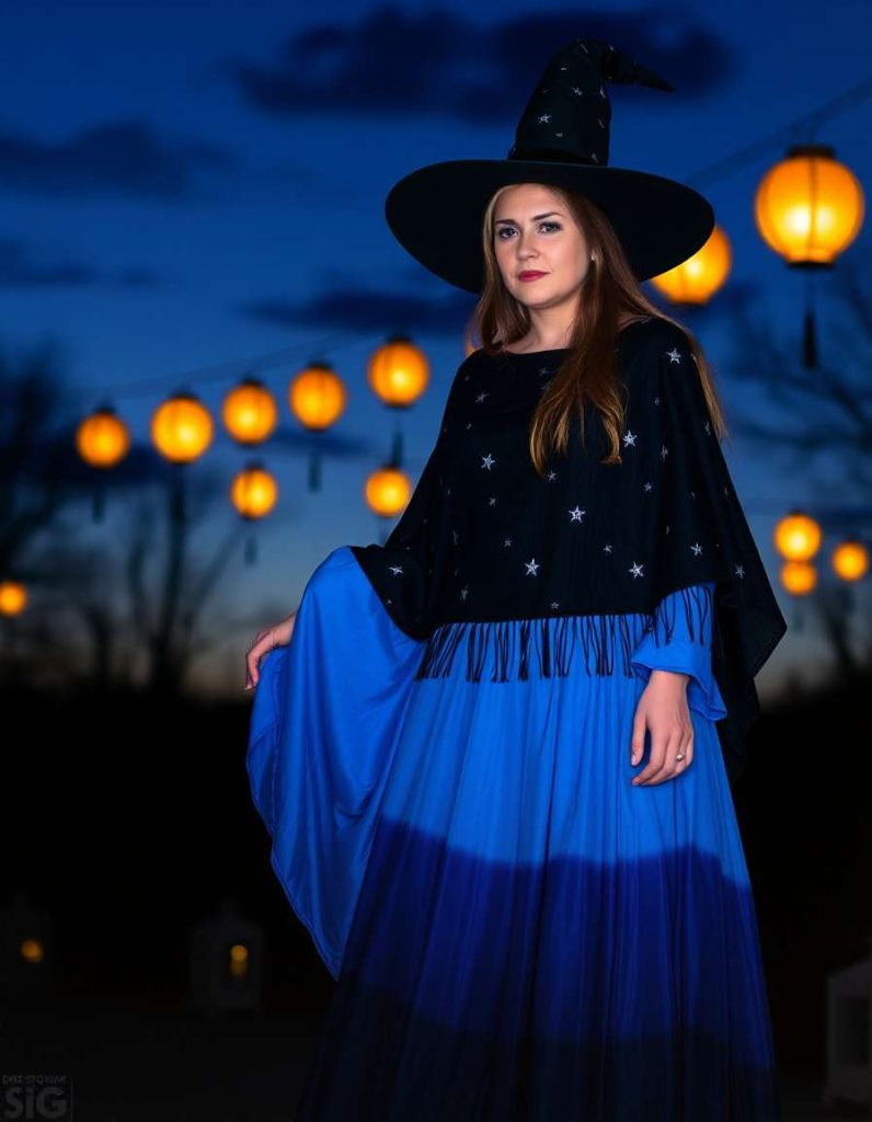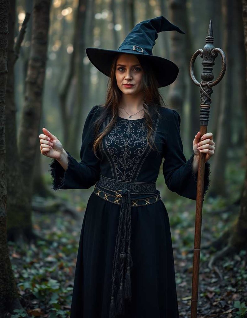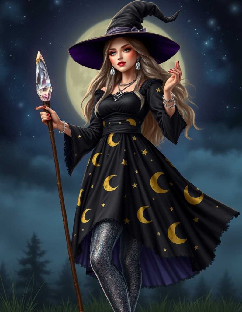 A whimsical take on the witch outfits aesthetic, this celestial witch dons a dress embellished with moon and star motifs. Silver jewelry and a crystal wand complete the ensemble, capturing the universe’s magic. Ideal for those who feel a connection to the stars and cosmos.