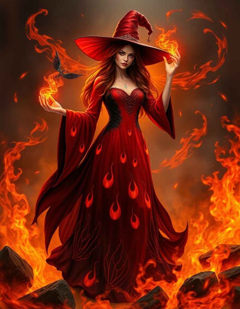 Embrace the sorceress fashion aesthetic with a red and black ombre gown featuring flame motifs. Enveloped in swirling fire magic, this daring outfit is ideal for those who channel the fire element in their spellcraft, emanating both energy and fervor.
