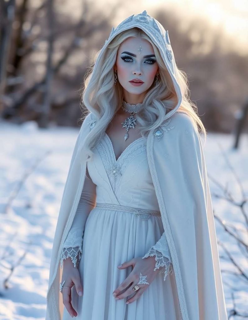 Bring the sorceress style to fruition with a frosty white gown and light gray cloak, accentuated by snowflake jewelry. This serene, icy aesthetic is fitting for sorceresses who are drawn to the magic of winter and its enchanting beauty.