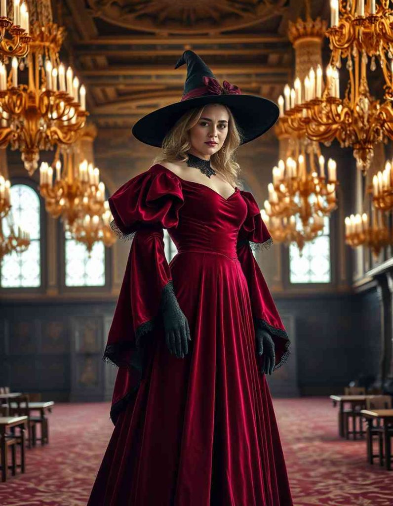 For a sorceress style that radiates sophistication and authority, a red velvet dress with dramatic sleeves and black lace gloves creates a breathtaking appearance. This opulent aesthetic is perfect for sorceresses who embody their enchanting and lavish side.