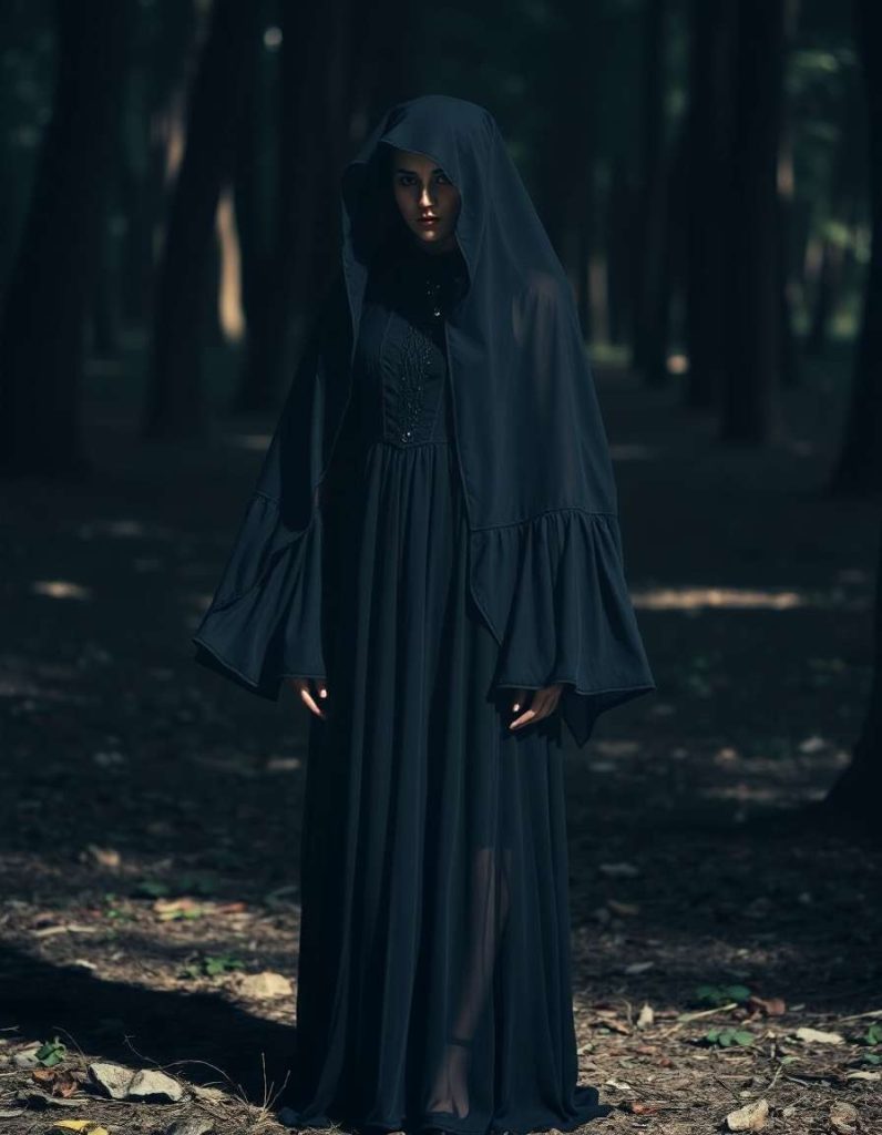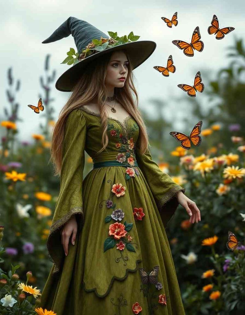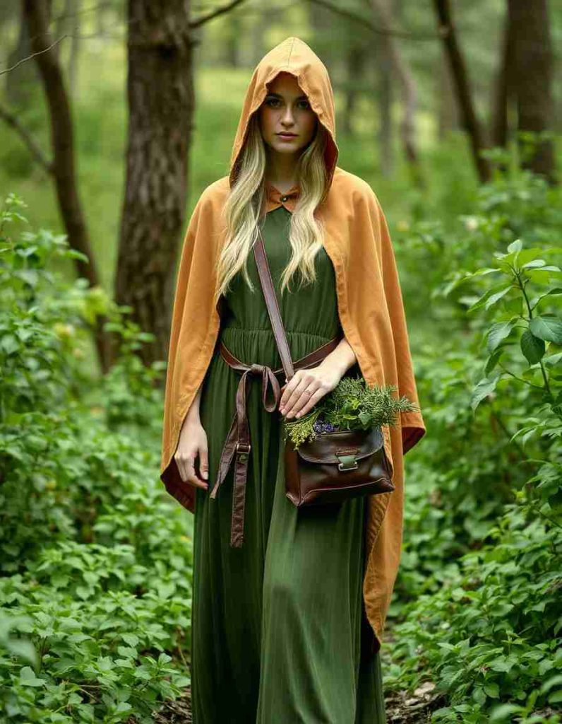 Embrace the witch outfits aesthetic with an earthy essence, featuring a green maxi dress and hooded cloak. This woodland-inspired appearance is perfect for those who resonate with nature’s spirits and the magic of the forest, complete with herbs and charms.