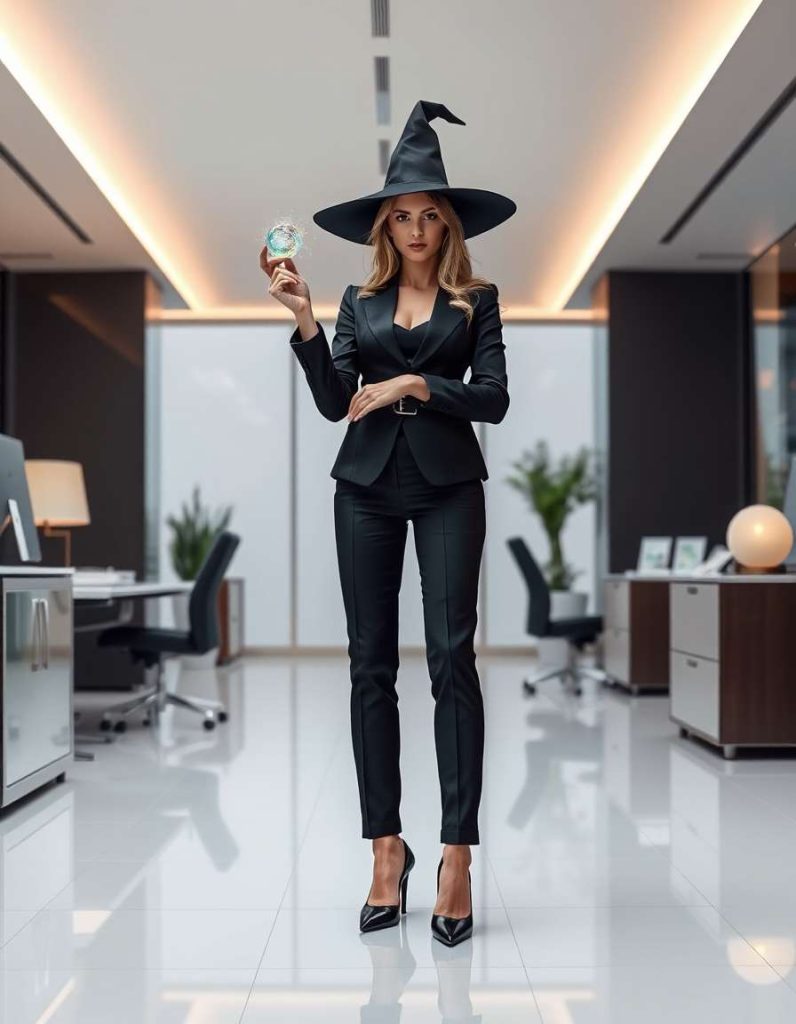 For a professional spin on the sorceress aesthetic, a black blazer, high-waisted slacks, and pointed shoes cultivate a sleek, modern appearance. A mystical accessory brings just the right dose of enchantment to the corporate realm.