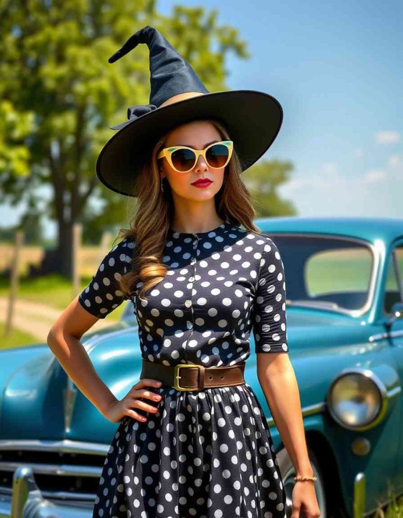 Embrace the sorceress style with a polka-dot dress inspired by the 1950s, cat-eye glasses, and a wide belt. Posing beside a classic vehicle, this outfit is ideal for sorceresses who blend retro charm with mystical enchantment.