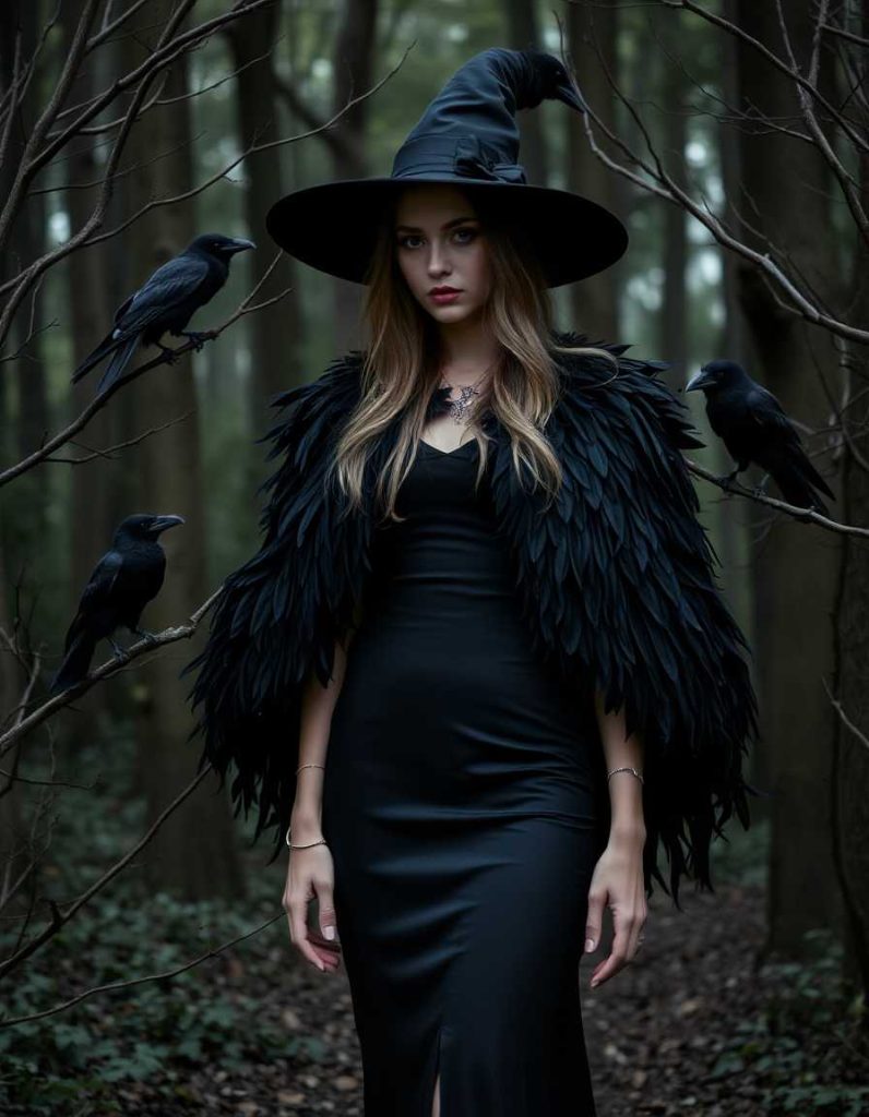 Manifest the sorceress aesthetic with a black feathered cloak over a sleek black gown. This enigmatic and shadowy look is perfect for sorceresses who resonate with the raven’s symbolism, standing amongst trees with ravens perched on the limbs.