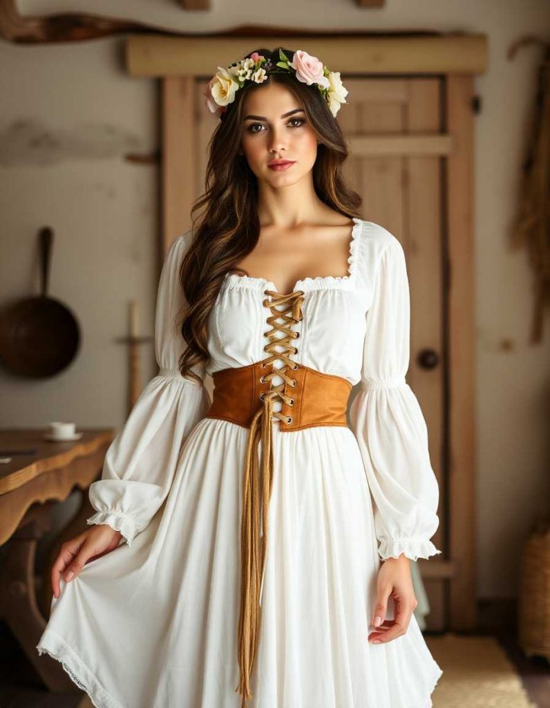 The witch outfits aesthetic meets rustic elegance with a flowing white peasant dress, lace-up corset belt, and a flower crown. This magical look is perfect for those who love connecting with nature and the enchanting countryside. It’s the ultimate mix of whimsy and witchcraft.