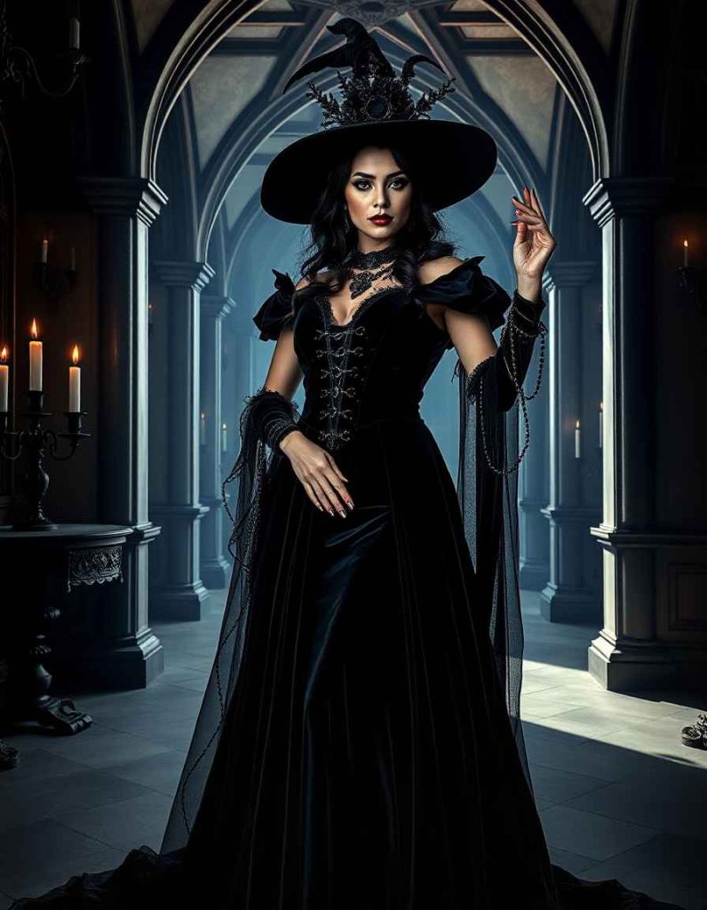 Embody dark sophistication with a gothic witch queen appearance, featuring a black velvet gown, spiked accessories, and striking makeup. The witch outfits aesthetic is brought to life with an ambiance of royalty and enigma, perfect for those who celebrate their dark, formidable side.