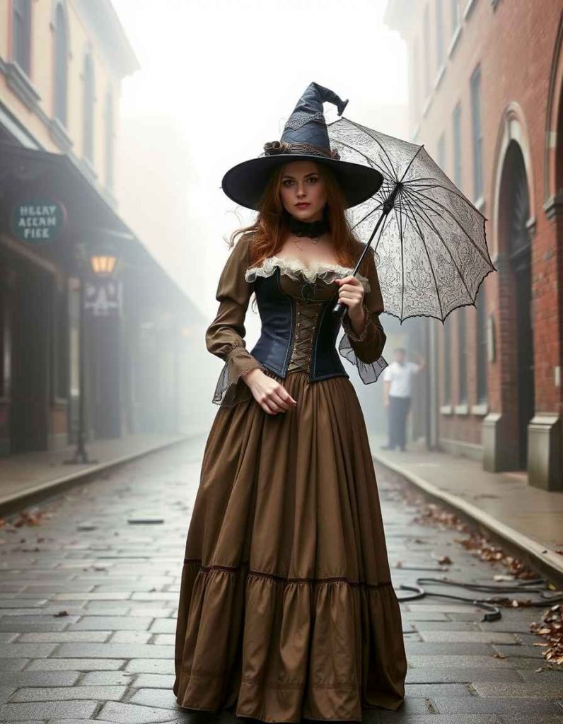 The witch outfits aesthetic takes a retro twist with this Victorian-inspired ensemble, showcasing a ruffled blouse, corset, and long flowing skirt. A lace parasol adds a touch of grace, ideal for anyone who cherishes the gothic elegance of yesteryears.
