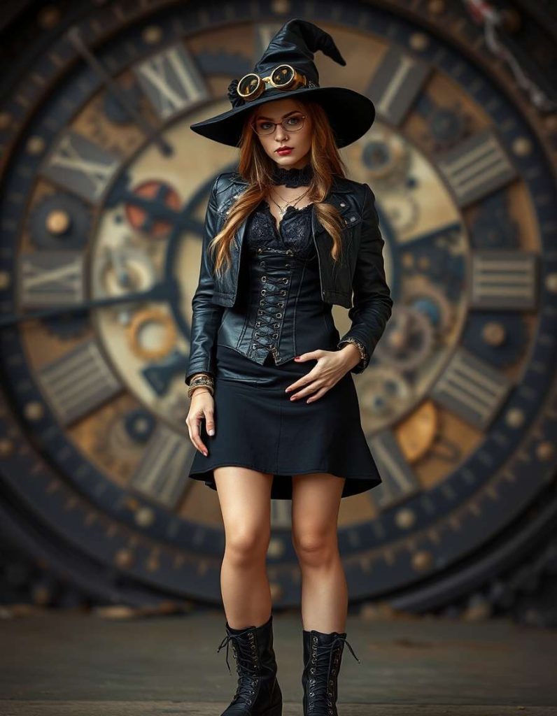 A blend of witchcraft and Victorian steam technology, the steampunk witch outfits aesthetic showcases a black corset dress, cropped leather jacket, and lace-up boots. Accessories such as brass goggles and gears enhance the appearance, perfect for those who wish to add a mechanical flair to their witchy style.