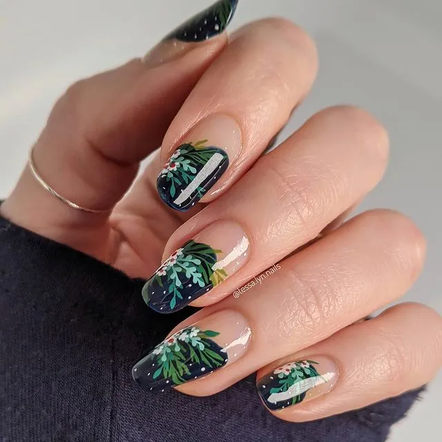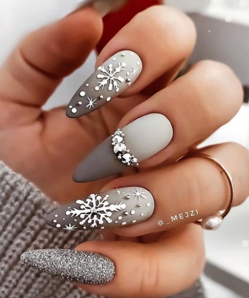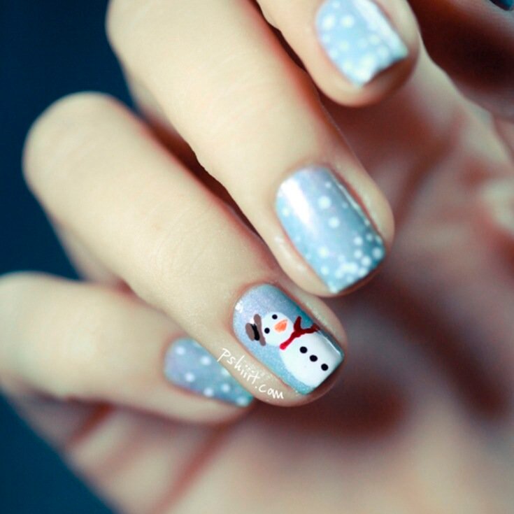 Embrace the allure of winter with real snow nails, which emulate the intricate designs of snowflakes drifting from the sky. These styles typically showcase icy blue, white, and silver hues, imparting an elegant frosty ambiance to your nails. Perfect for those seeking a subtle yet festive Christmas nail design.