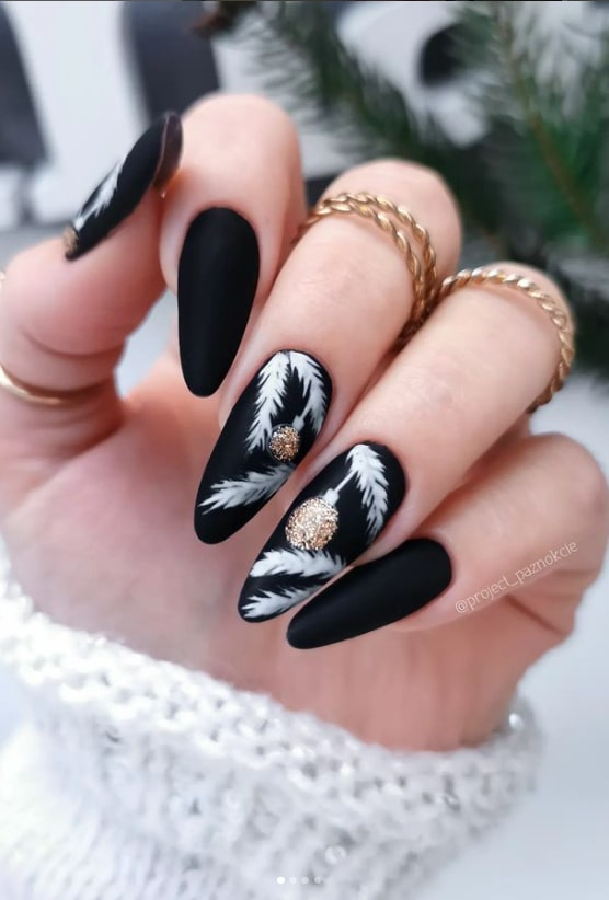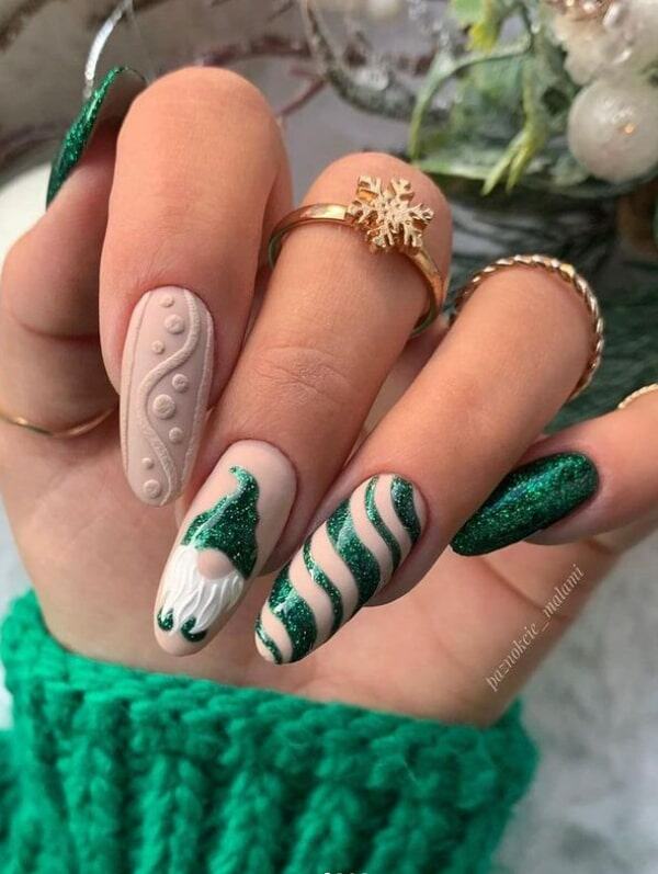 Achieve the ideal holiday appearance with these nails that blend sparkling glitters and festive motifs. This design is an excellent fusion of sophistication and festivity, rendering it perfect for adding a glamorous finish to your holiday ensemble. Whether you’re attending a party or a family dinner, these nails will enhance your overall appearance.