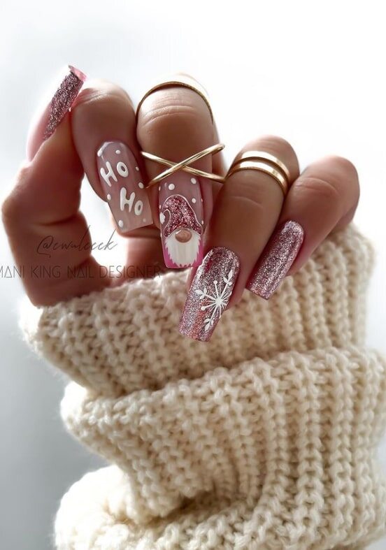 Pink pastels winter theme nails offer a gentle and feminine approach to holiday nail art, featuring soft pink tones paired with subtle wintry motifs such as snowflakes or sparkle. This design suits those who cherish pastel shades and desire a distinct take on traditional Christmas nails.