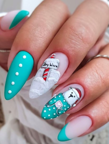 Charming and imaginative, polar bear nails bring the essence of winter to life with adorable white bears against a snowy background. These styles are fantastic for those who appreciate fun yet sophisticated Christmas nail art. The polar bear theme provides a distinctive way to celebrate the holiday season.