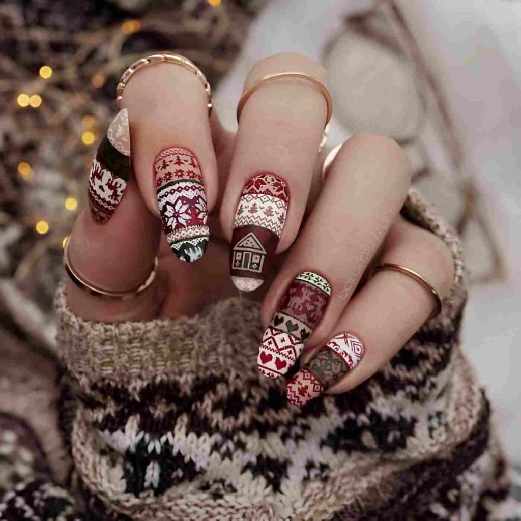 Snuggle up with sweater-weather nails, a fashionable creation that emulates the texture and patterns of winter knits. These nails are ideal for capturing the season’s snug atmosphere while infusing a chic twist into your holiday appearance. They represent an inventive and festive choice for remaining warm and fashionable.