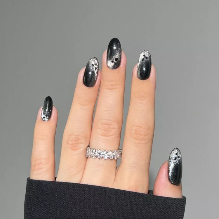 Invoke the enigma of a dark, eerie night with this hauntingly stylish ghost nails design. Showcasing profound black shades fused with smoky grays and subtle starry touches, these nails capture the essence of a chilling evening. Perfect for those who appreciate dramatic yet sophisticated nail art, this look encapsulates the allure of the unknown.