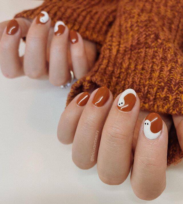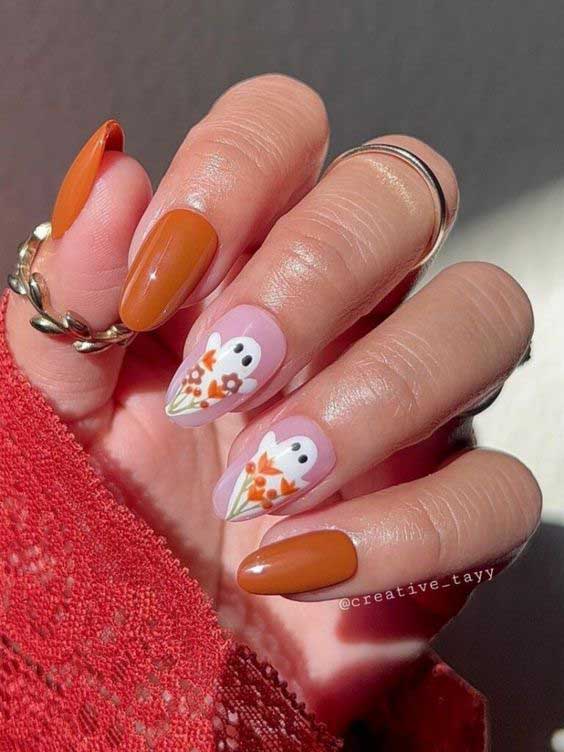 Honor the season with autumn-themed ghost nails showcasing warm hues and ghostly accents. Tones of orange, brown, and cream blend beautifully with the spooky designs. Ideal for those who love to celebrate the Halloween essence in fall.