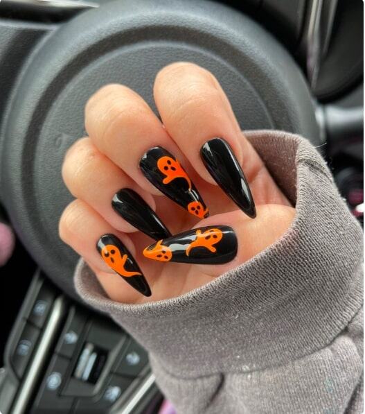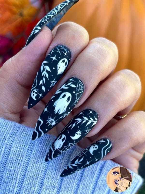 Make a striking impression with pointed ghost nails. The stiletto style combined with ghost designs injects drama and sophistication into your manicure. Perfect for those who appreciate bold, edgy nail art enhanced with a spooky vibe.