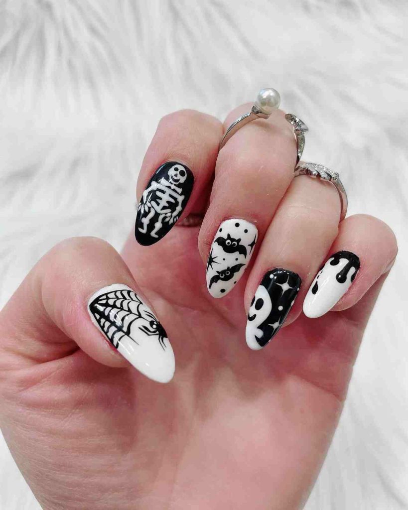 Fuse simplicity with spookiness through short black and white nails. These contrasting hues form playful ghost figures that are eye-catching and delightful. Perfect for a minimalist yet festive flair, they’re great for casual Halloween aesthetics or everyday wear with a unique touch.