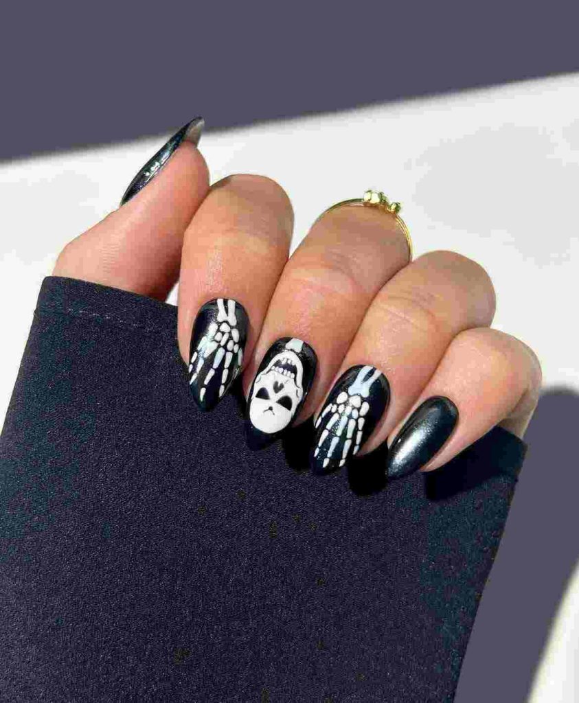 Embrace the shadowy side with jet black ghost nails adorned with skeletal motifs. These striking nails emanate gothic sophistication and are ideal for making a bold impression. A must-experience for enthusiasts of edgy and haunting nail artistry.