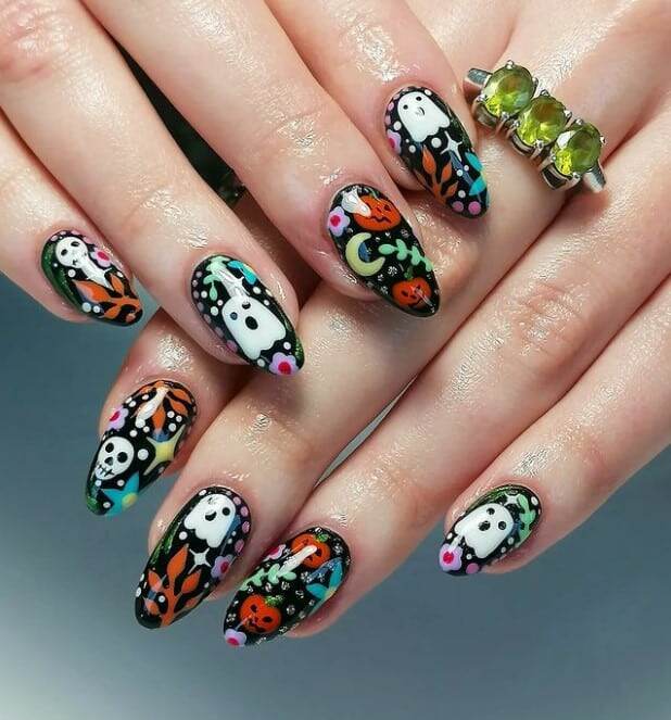 Honor the fall season with ghost nails that fuse floral patterns and spooky elements. Warm autumn colors like burnt orange and mustard yellow create a seasonal backdrop for the ghostly features. An excellent selection for merging Halloween spirit with autumn grace.