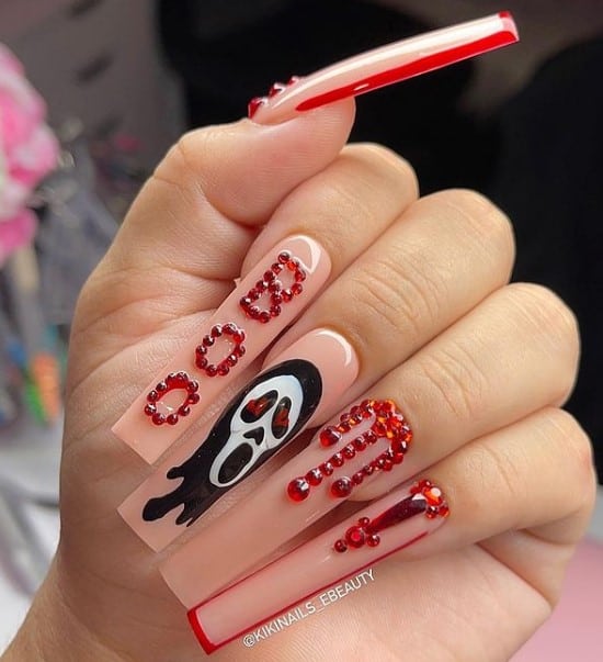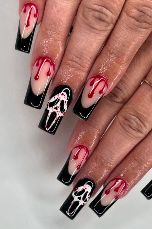 Add a gruesome twist to your ghost nails with this bloody design. Deep crimson accents dripping from ghostly shapes create a thrilling effect. Ideal for Halloween gatherings, these nails inject a dramatic yet fashionable essence to your manicure.