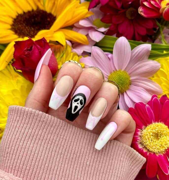 Infuse cinematic terror into your nailswith patterns influenced by the legendary “Scream” saga. Ethereal visages and precise detailing transform these nails into an exhilarating homage. A daring selection for horror aficionados eager to make a statement.