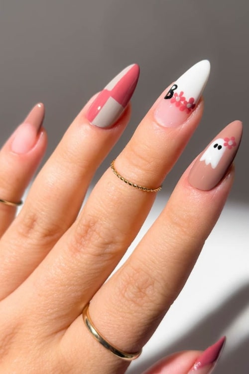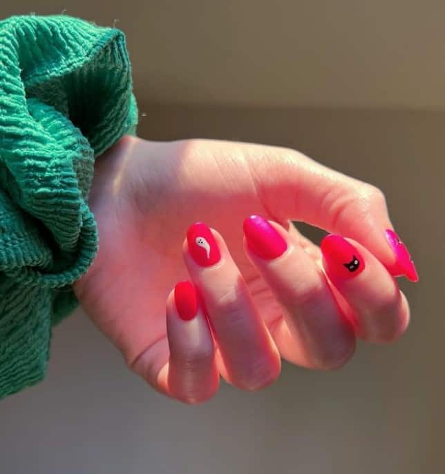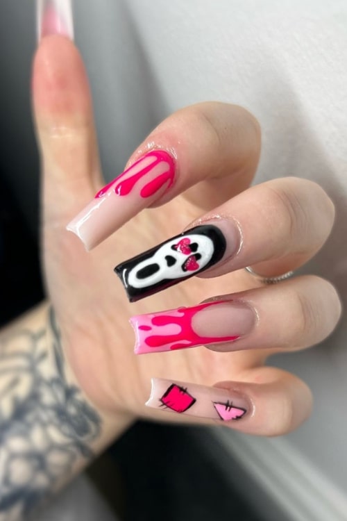 Add a splash of color to your ghost nails with dripping pink highlights. This design combines gentle pink shades with spooky shapes for a look that’s equally adorable and chilling. Ideal for those who enjoy feminine yet ghostly nail art.