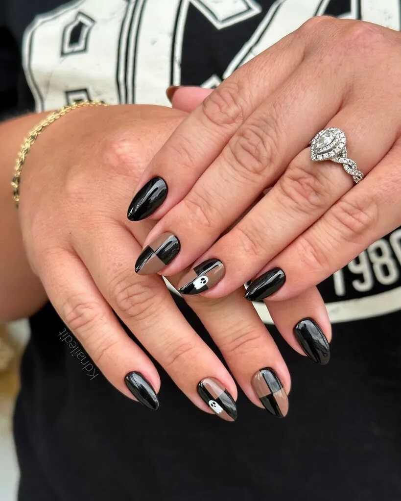 Embrace the spookiness with a frightful black ghost nails design. Deep black bases with spooky ghost shapes create a hauntingly dramatic manicure. Perfect for Halloween or whenever you wish to showcase your darker aesthetic.