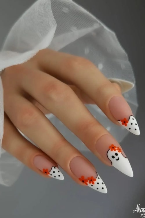 Combine eerie with delightful in a ghost nails design featuring floral embellishments. Delicate flowers matched with ghost motifs produce a whimsical yet hauntingly lovely appearance. Ideal for those who enjoy merging seasonal styles with elegance.