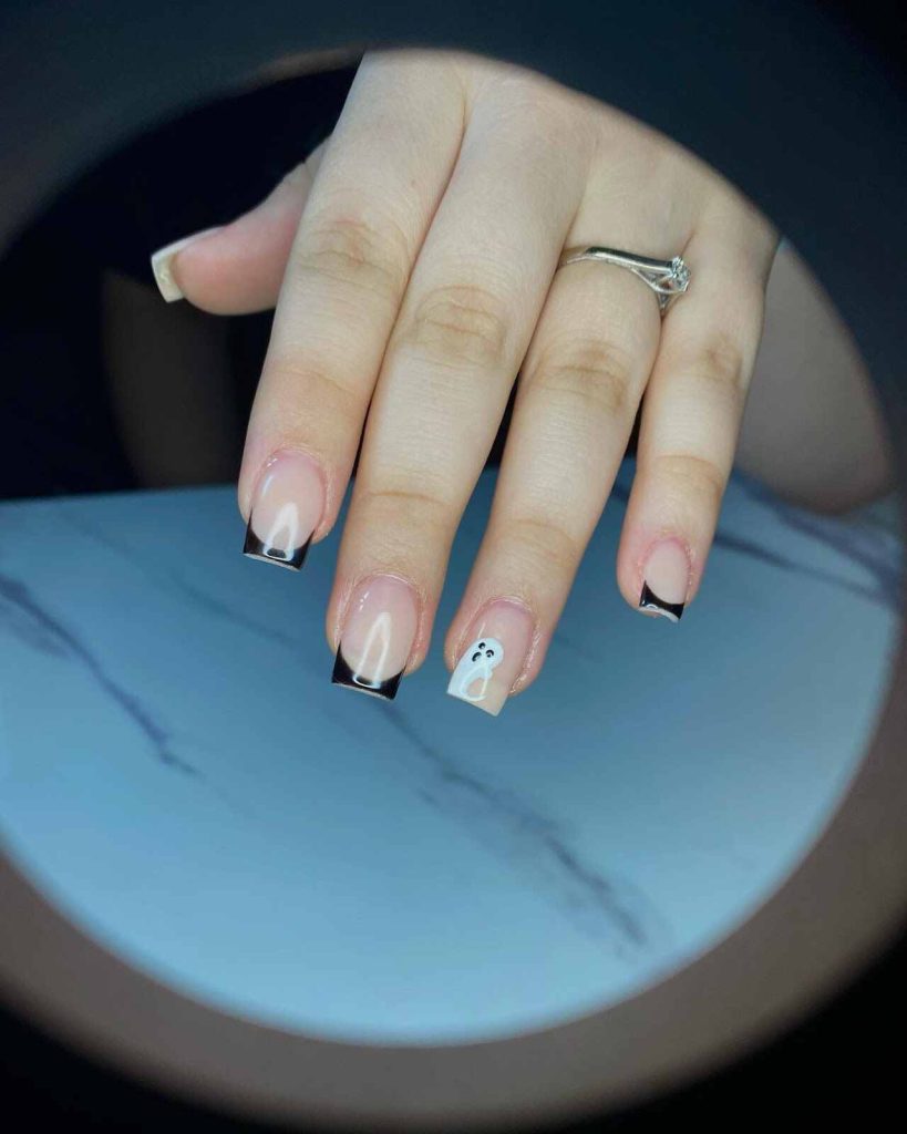 Elevate the classic French manicure with ghost nails. Substitute the white tips with faint ghostly outlines for a playful yet elegant effect. Perfectly blending sophistication with seasonal charm, these nails are hauntingly stunning.