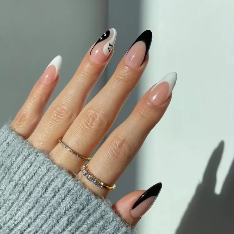 Unite harmony and haunting style through yin-yang ghost nails. This black-and-white design harmonizes playful ghost figures with a symbolic element. Ideal for those who appreciate inventive and meaningful nail art, this look is both stylish and striking.