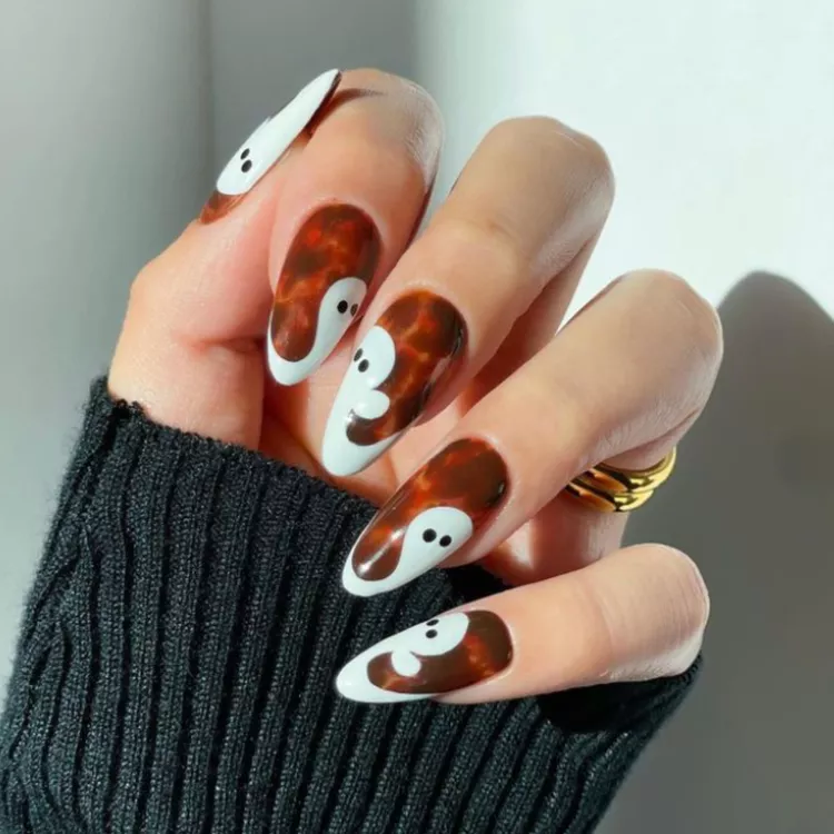 Mingle traditional tortoise shell designs with ethereal motifs for a distinctive ghost nail creation. The deep browns and blacks form a cozy background for eerie embellishments. This aesthetic is ideal for merging sophistication with seasonal allure.