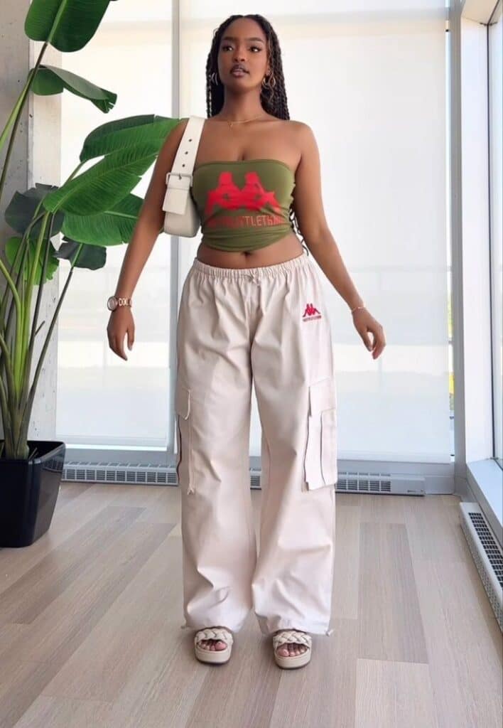 Achieve an iconic Y2K Ensembles appearance with a tube top matched with cargo trousers for a mix of casual and fashionable. Tube tops, frequently showcasing vibrant colors or designs, harmonize with the utilitarian aesthetics of cargo trousers, making it a perfect outfit for a nostalgic throwback. Complete the ensemble with chunky sneakers for added style.