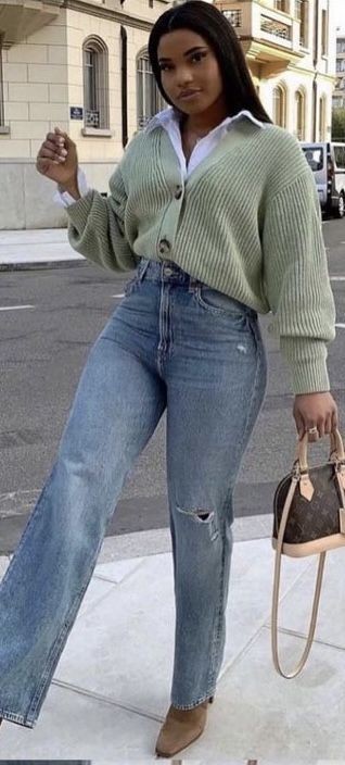 Bootcut trousers teamed with a snug cardigan are ideal for encapsulating the essence of Y2K Ensembles with a hint of retro charm. The flared shape of the trousers combined with the relaxed style of the cardigan creates a cozy yet stylish aesthetic. Perfect for informal gatherings or a chill day.