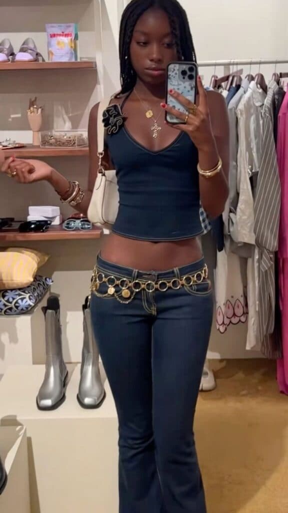 Low bootcut jeans represent a timeless Y2K Outfits staple that encapsulates the relaxed, casual aesthetic of the early 2000s. With their flared bottoms and low-rise fit, these jeans pair flawlessly with various tops, ranging from fitted t-shirts to breezy blouses. Finish off the look with a pair of nostalgic sneakers inspired by retro styles.